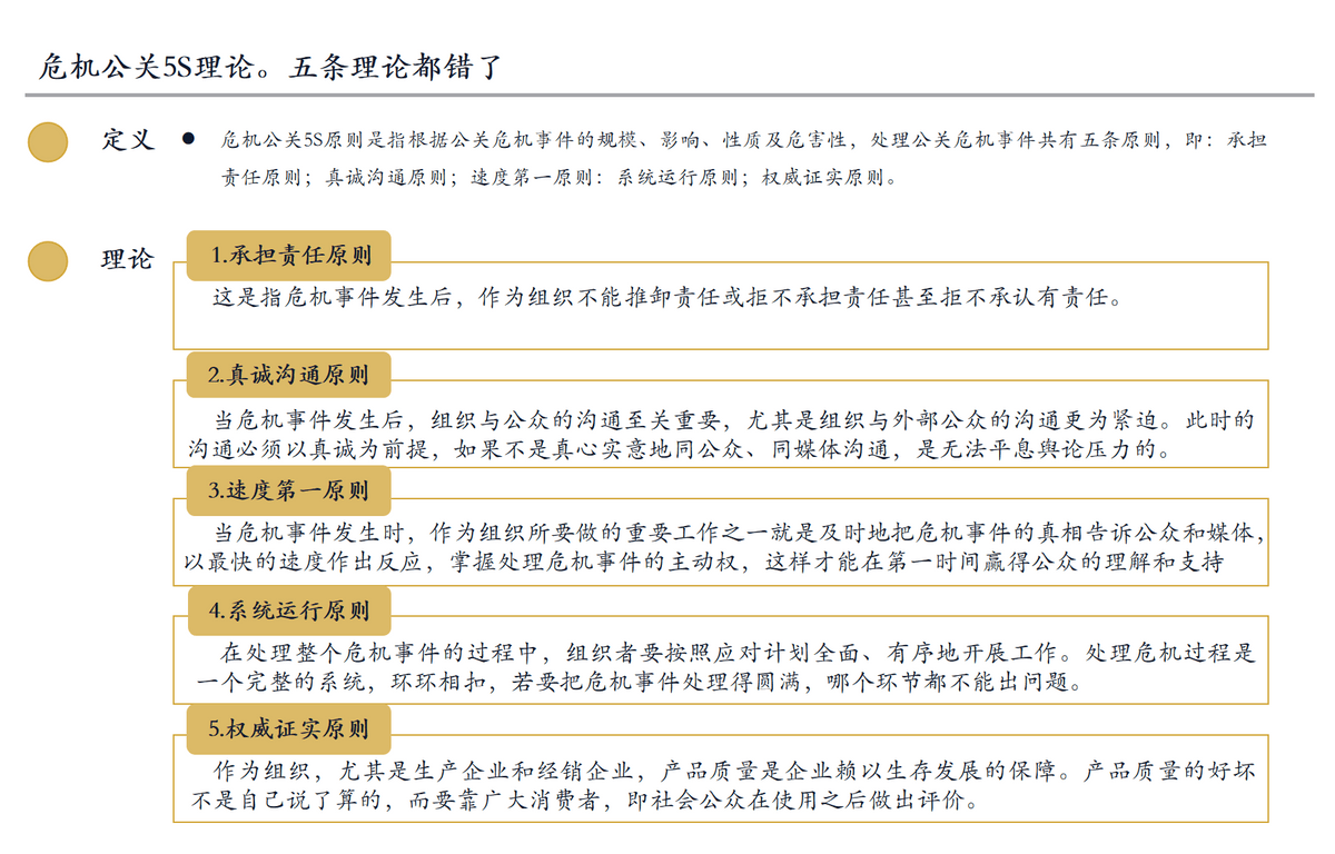 总结:西贝的舆情应对素质是危机公关 5S 理论的全面:从“推卸义务”到“沟通失焦”,从“响应畅后”到“系统紊乱”,再到“自证乏力”,每一步都加剧了反噬。这也印证了理论的焦点:危机处置是环环相扣的系统工程,任何环节的失误城市导致全局失控。