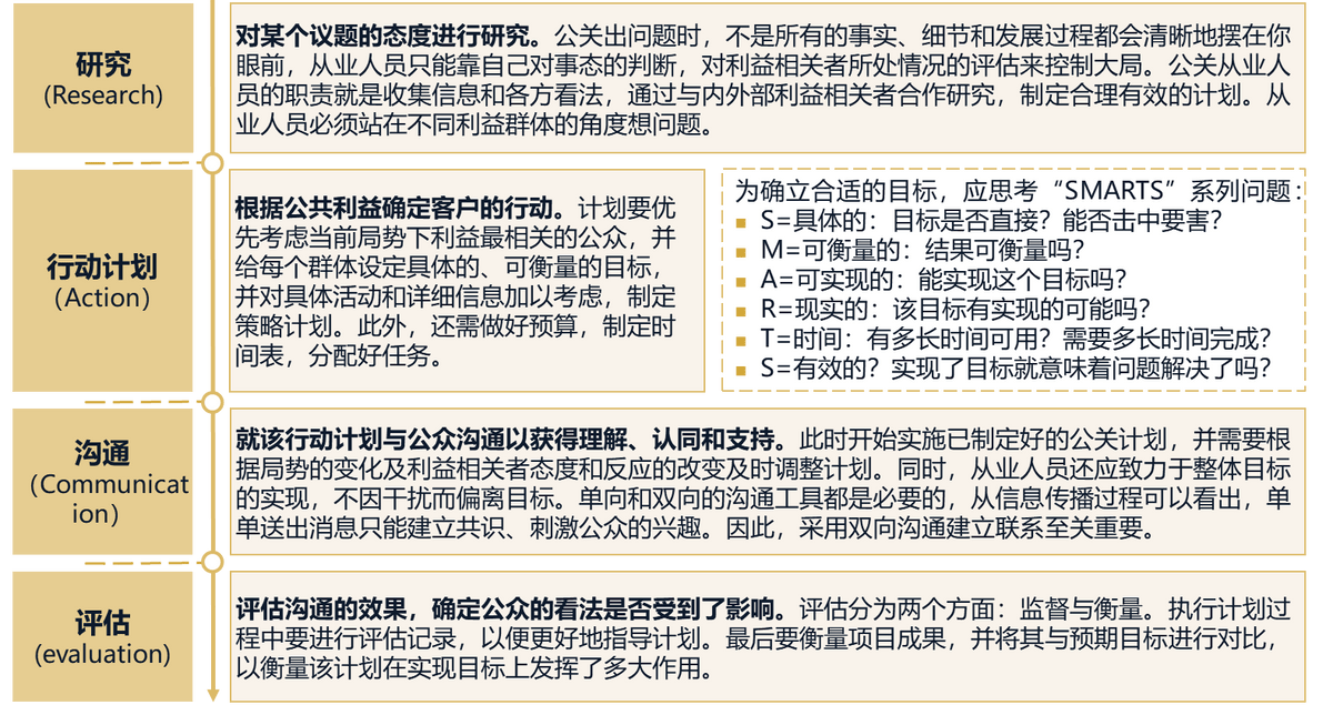 从企业来说,公共关系是其办理手段和办理本能机能之一,办理视角下的公关过程要求遵照“R-A-C-E”四步模式。舆情危机应对取处置,做为企业公关本能机能下的具体公关项目使命,也要求严酷按照这四步进行办理。前期对要处置的舆情议题研究定位能否精准、判断能否准确,决定了整场舆情公关勾当的成败;步履打算能否婚配议题定位、能否合适“SMART”准绳,则影响问题处置本色成效;沟通能否充实争取到理解和支撑,对于可否成立共识影响庞大;最初能否无效评估沟通结果,决定了下一关勾当的步履标的目的。